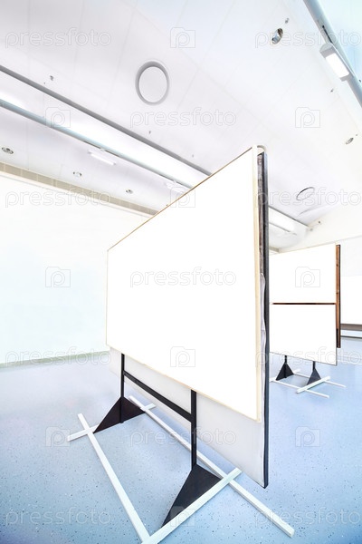 Белый экран стоит в минималистическом внутреннем пространстве