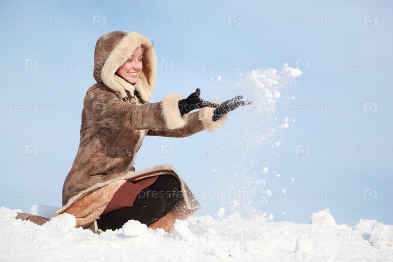 Ребенок в зимнем пальто бросает снежинки в воздух