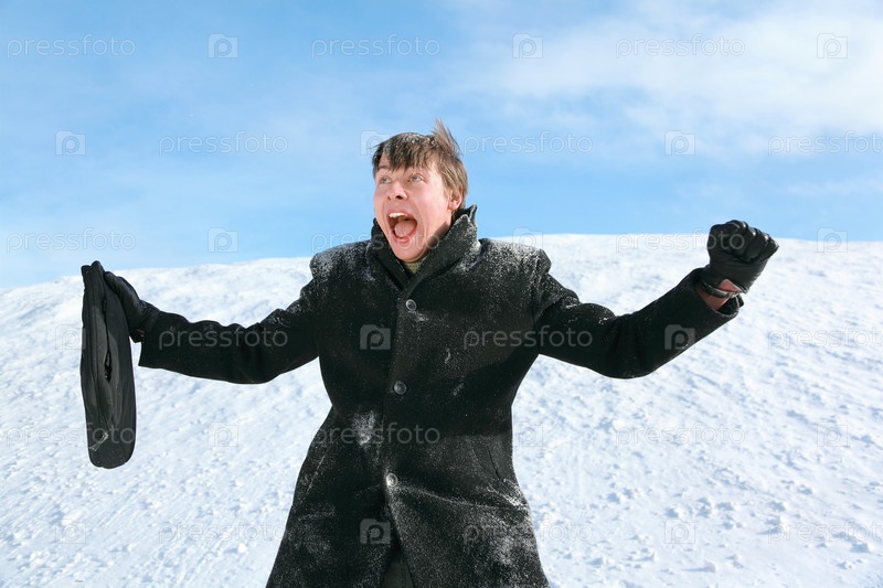 Мужчина кричит на покрытом снегом поле, широко распростертые руки
