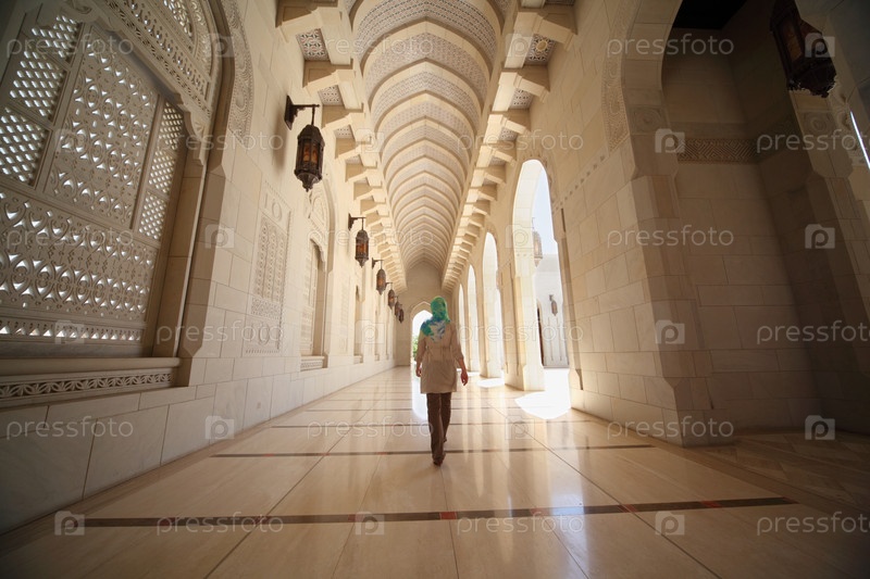 Женщина с платками ходит по коридору внутри Великой мечети в Омане
