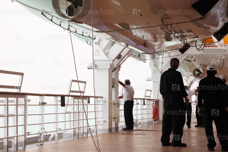 Сотрудники службы в черной форме стоят на палубе круизного лайнера, вид