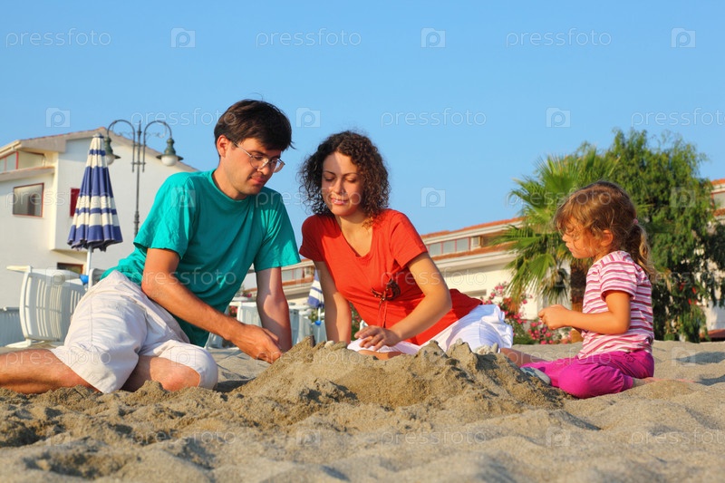 Мать с отцом и дочерью сидят днем на пляже и строят холмы