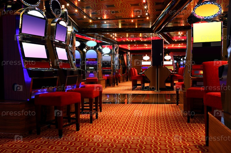 Роскошный интерьер казино с светящимися игровыми автоматами и красными сиденьями