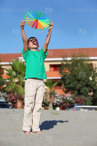 Мальчик стоит на песке, поднимает руки вверх и смотрит на цветных