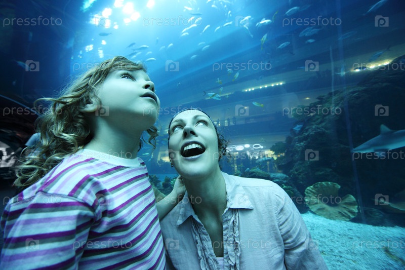 Мать и дочь в туннеле подводного аквариума, удивленные лица