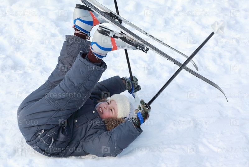 Молодой мальчик со лыжами и палками, лежащим на снегу