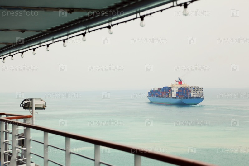 Синий грузовой корабль плавает по спокойному морю
