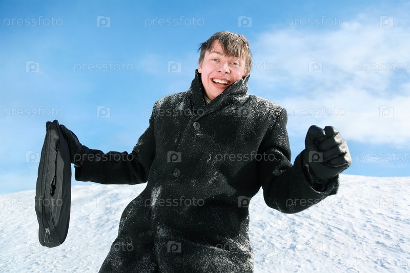 Мужчина смеется на снежном поле, в зимнем пальто и перчатках