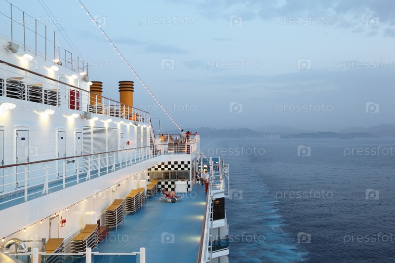 ОМАН - 13 апреля 2010 года: большой круизный корабль едет вечером. свет включен. несколько