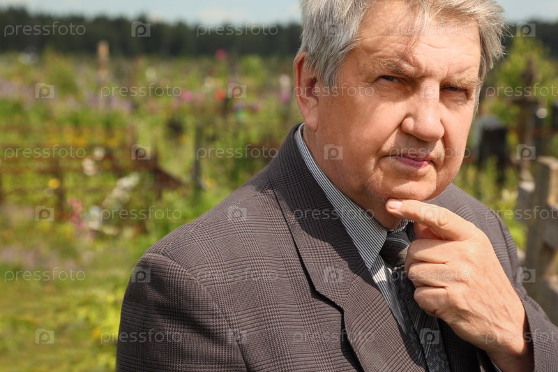 Старый серьезный старший в сером костюме, стоящий на кладбище с рукой на подбородке