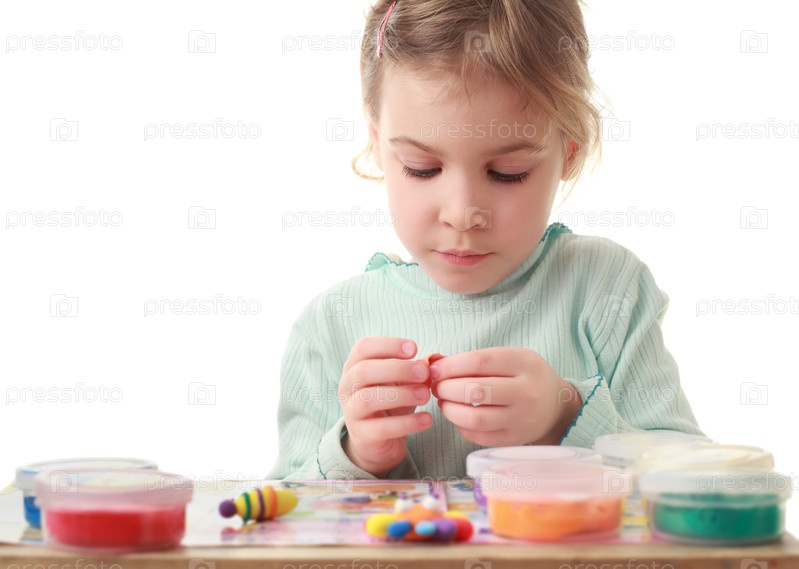 Маленькая девочка сидит за столом и тщательно скульптурует фигуры, которые делает из