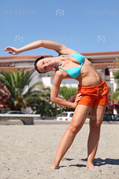 Молодая красавица делает гимнастические упражнения на пляже и улыбается, дом