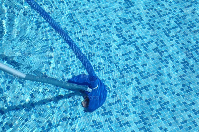 Голубой уборщик бассейна плавает на плиточной поверхности воды
