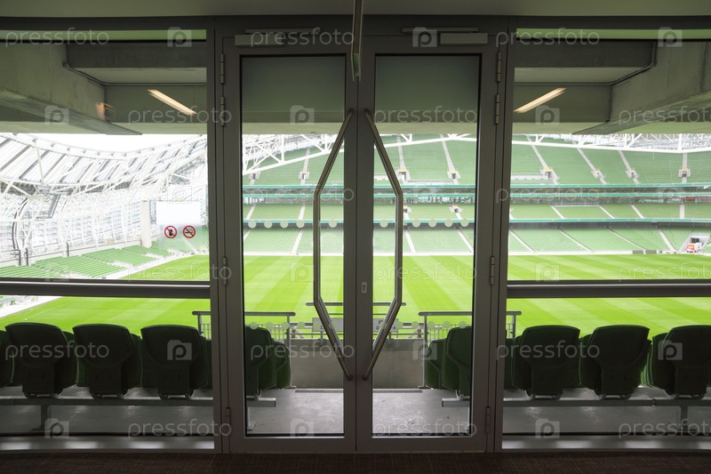ДУБЛИН - 10 ИЮНЯ 2010: Дверь и ряды зеленых, складывающихся сидений в большом