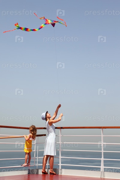 Молодая мать и дочь играют с многоцветным змеем, стоя