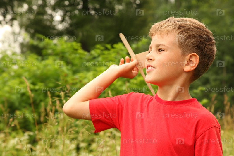 Мальчик в красной футболке, который играет с деревянным игрушечным самолетом на природе