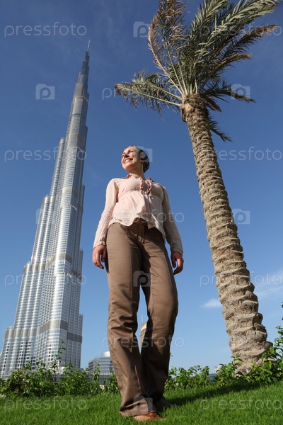 ДУБАЙ - 17 АПРЕЛЯ: небоскреб Бурдж-Дубай, женщина стоит перед ним