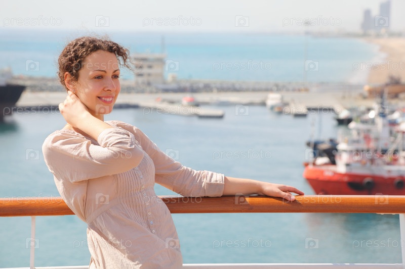 Улыбающаяся красивая женщина в фокусе. суда в порту Кабус в нефокусном положении
