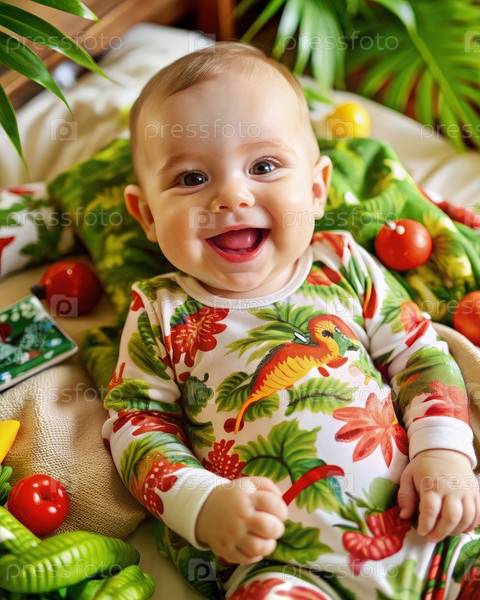 Очаровательный ребенок улыбается в тропическом раю, окруженный красочными фруктами во время отдыха