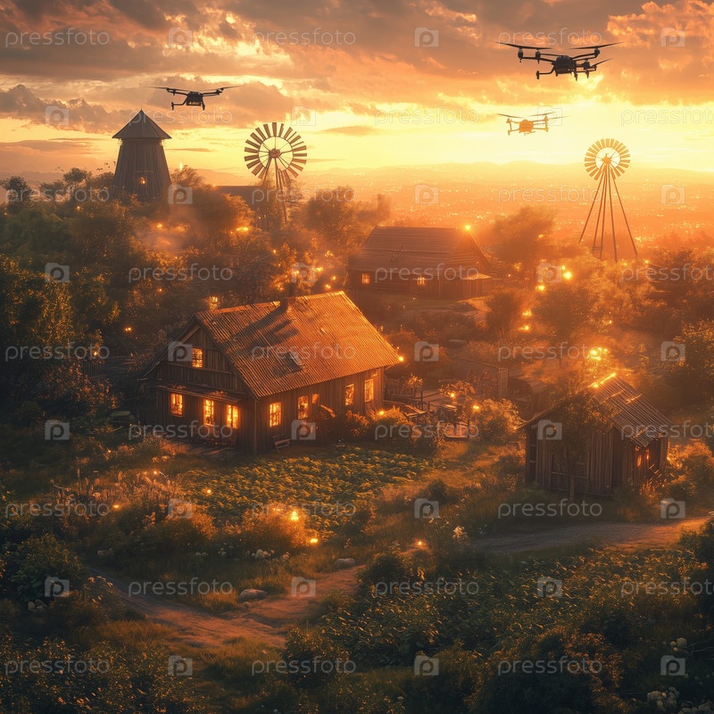 Футуристическая ферма с дронами, летающими над полями при закате солнца