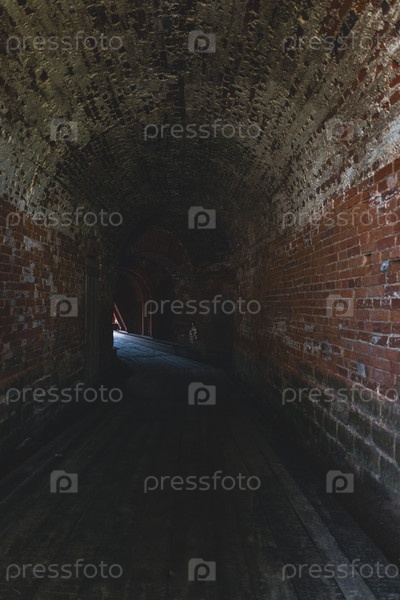 Темный кирпичный туннель в исторической крепости с арочным потолком