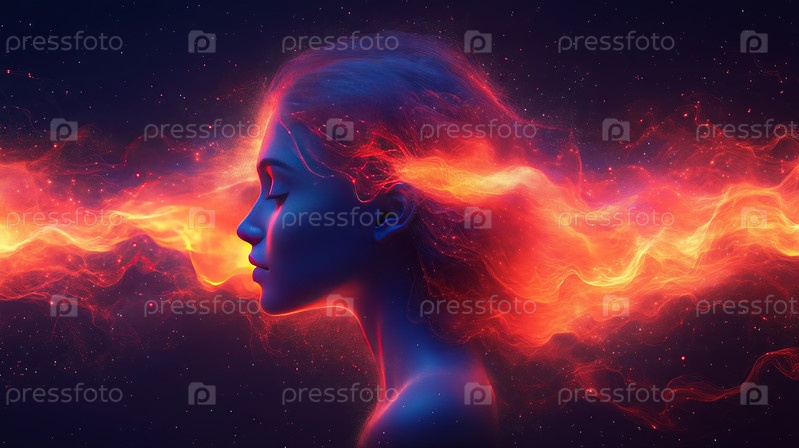 Профиль женщины с ярким потоком огненной энергии в пространстве