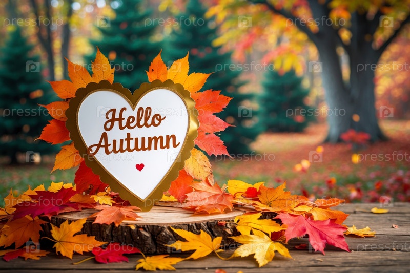 AI Generative Поздравление с надписью Привет, осень-осень на фоне желтых и красных листьев