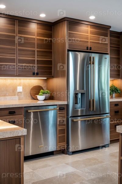 Современный стильный модный кухонный интерьер с деревянной мебелью и предметами домашнего обихода AI Generative