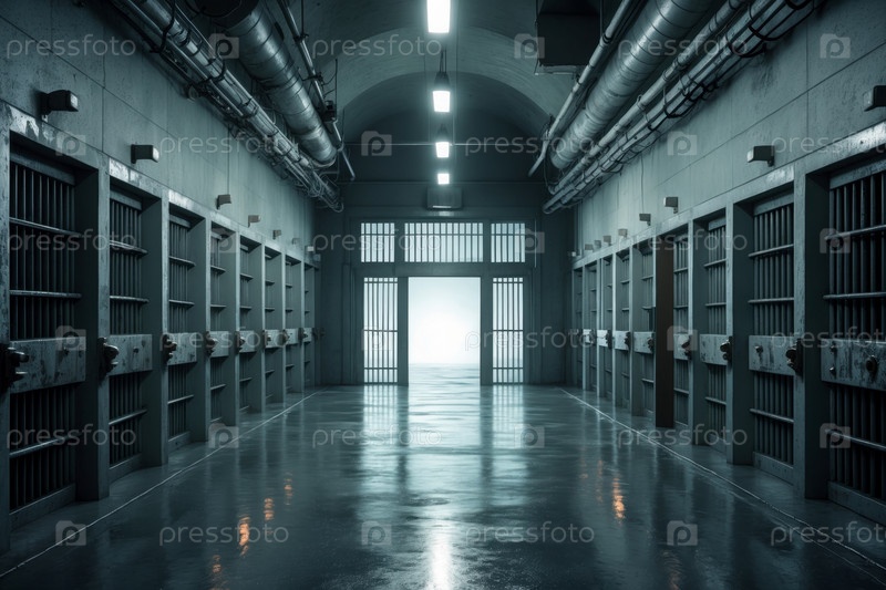 Интерьер тюремного здания внутри, коридор с изоляцией тюремной камеры стальные двери AI Generative