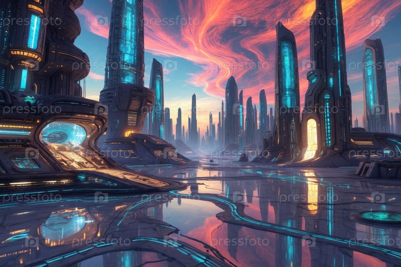 ИИ генеративный футуризм научная фантастика городской cityscape, кибер-город городская панорама будущее зданий