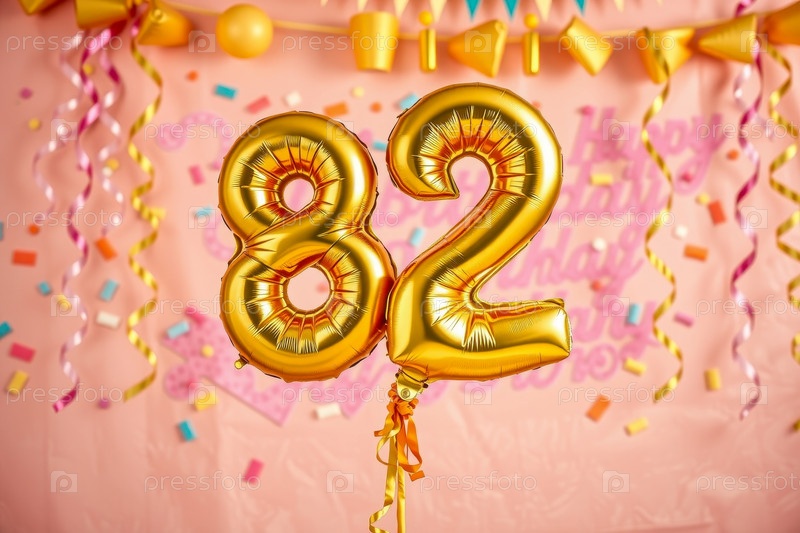 Гелиевый баллон на день рождения номер восемьдесят второй, фигура золотых букв 82 праздник праздничный фон