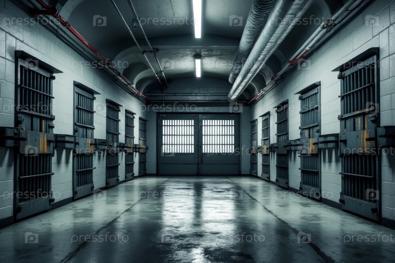 AI Generative Интерьер тюремного здания внутри, коридор с изоляцией тюремной камеры стальные двери