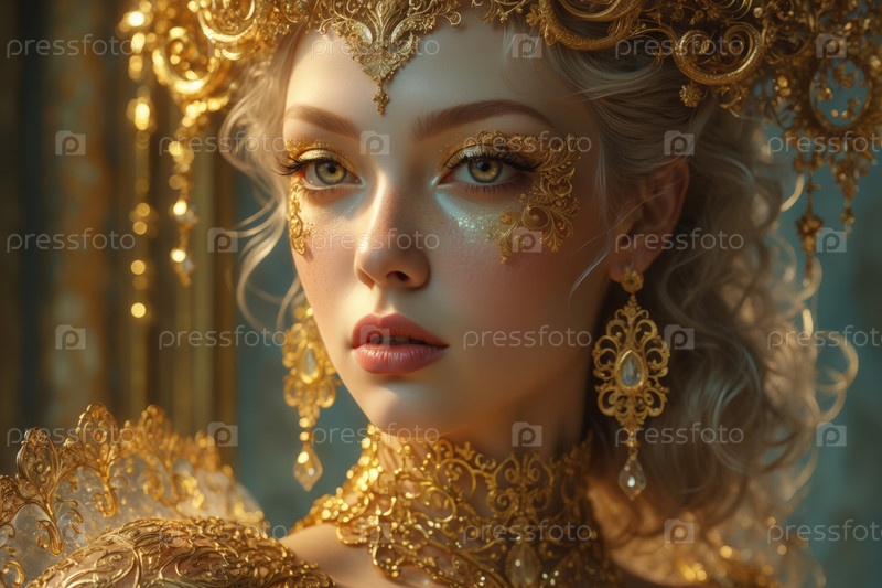 AI Generative Fantasy портрет молодой красивой женщины-магической модели на фоне золотых цветов из сказки