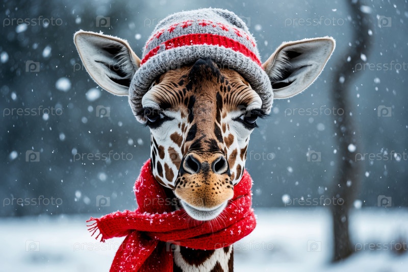 ИИ генеративный портрет жирафа в вязанной зимней одежде шляпа и шарф, животное во снежных дождях зимой