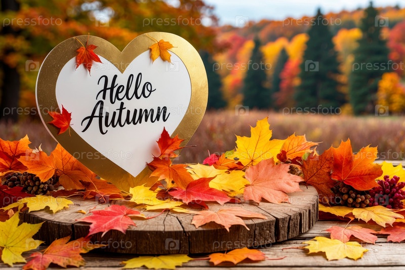 AI Generative Поздравление с надписью Привет, осень-осень на фоне желтых и красных листьев