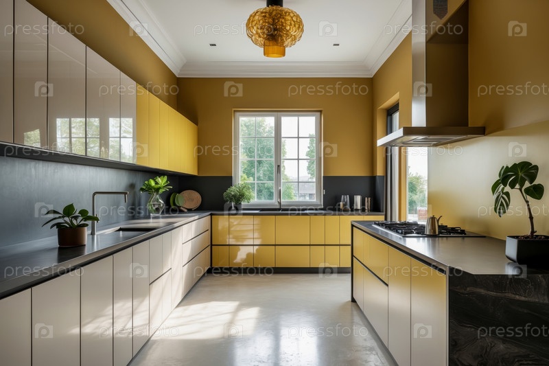 Современная стильная модная кухня интерьер желтого цвета мебель и бытовые принадлежности AI Generative