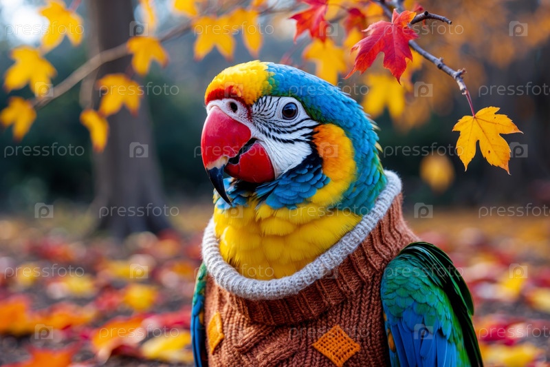 AI Generative Папуга в трикотажном свитере на осеннем лесном фоне, животное в красных и желтых листьях