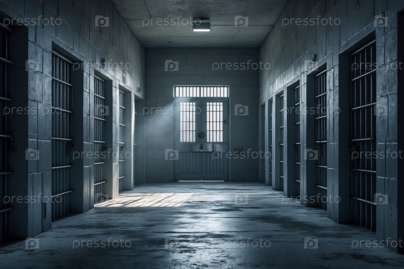 AI Generative Интерьер тюремного здания внутри, коридор с изоляцией тюремной камеры стальные двери