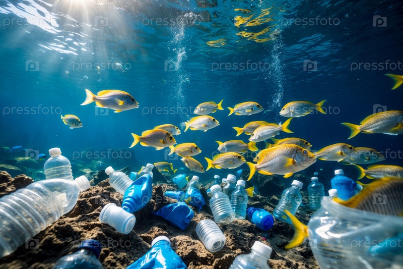 ИИ генеративная рыба плавает через пластиковые бутылки и мусор, свалку загрязнения окружающей среды, повреждение морских животных