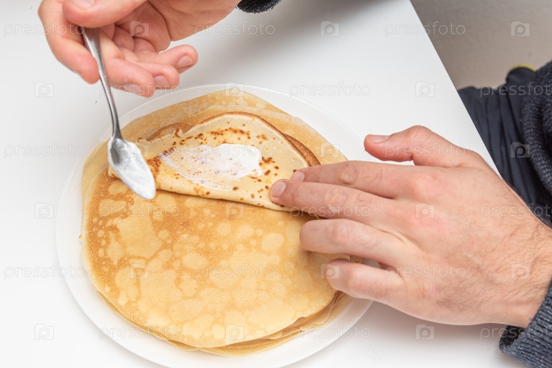 Мужчина распространяет крем на плоский круглый блинчик, завтрак утром в кафе