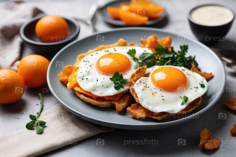 AI Generative Скремблированные жареные яйца тарелка на столе, сердечная вкусная традиционная кулинарная бранч кухня