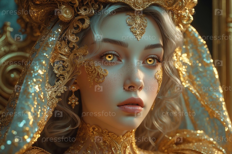 Фантастический портрет молодой женщины магическая модель на фоне золотых цветов из сказки AI Generative