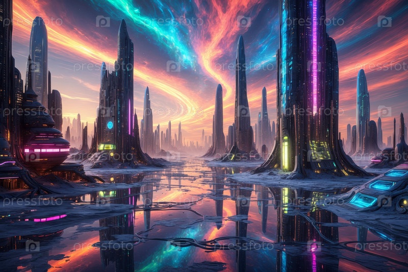 ИИ генеративный футуризм научная фантастика городской cityscape, кибер-город городская панорама будущее зданий