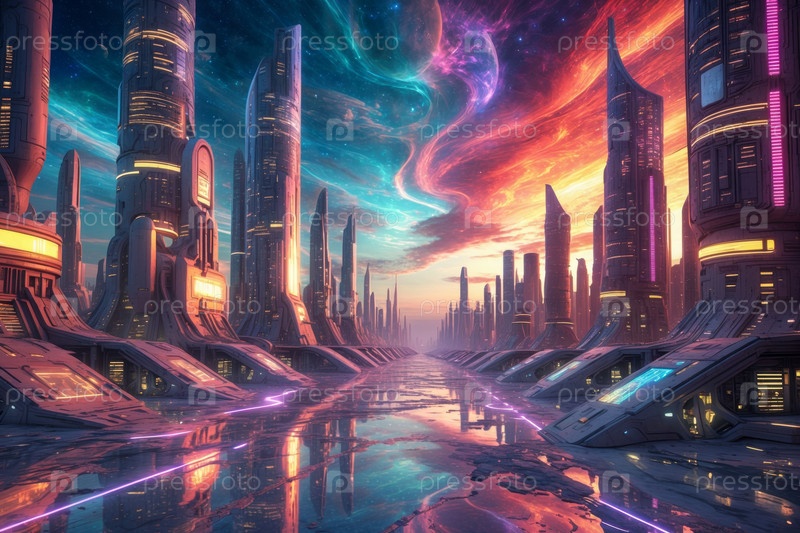 ИИ генеративный футуризм научная фантастика городской cityscape, кибер-город городская панорама будущее зданий