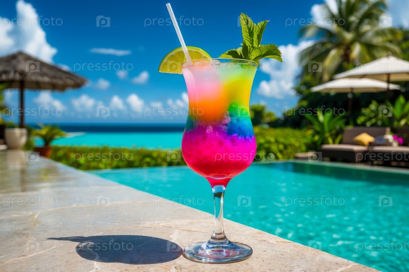AI Generative Алкогольный коктейль на фоне бассейна, летний напиток фрукты в отпуске sea ocean