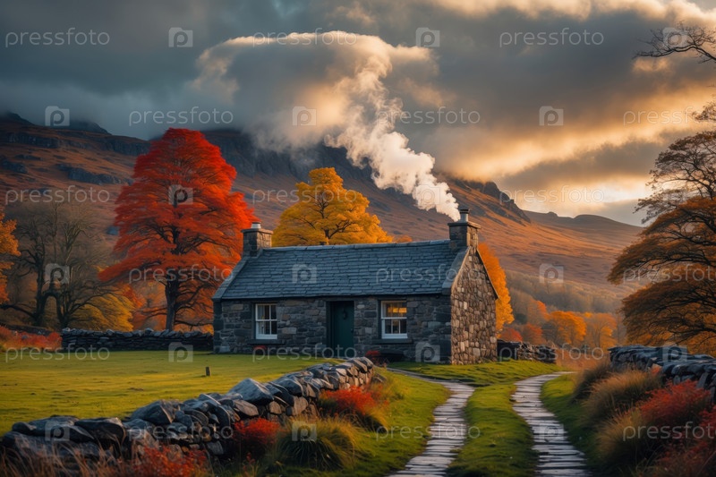 ИИ генеративный дом ландшафт здания на фоне красно-желтого листа осень осень осенний лесной парк