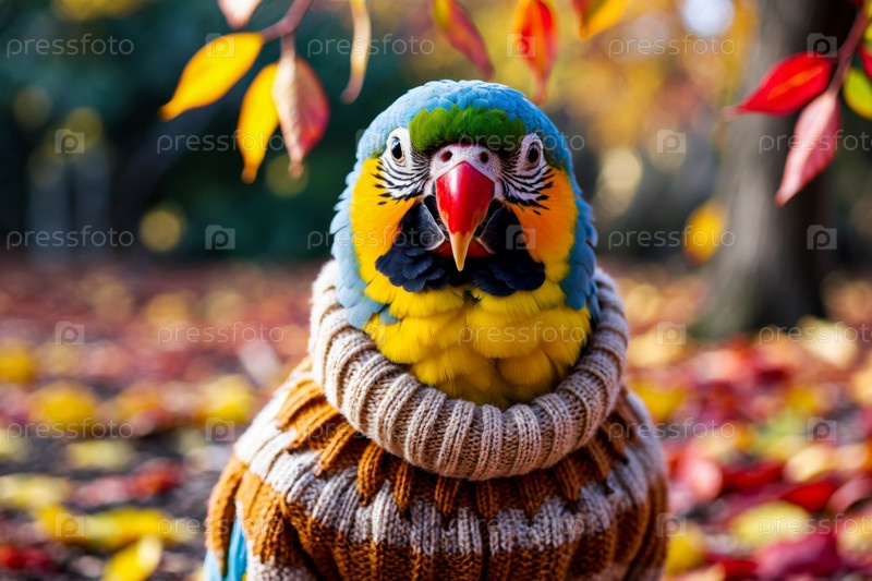 AI Generative Папуга в трикотажном свитере на осеннем лесном фоне, животное в красных и желтых листьях