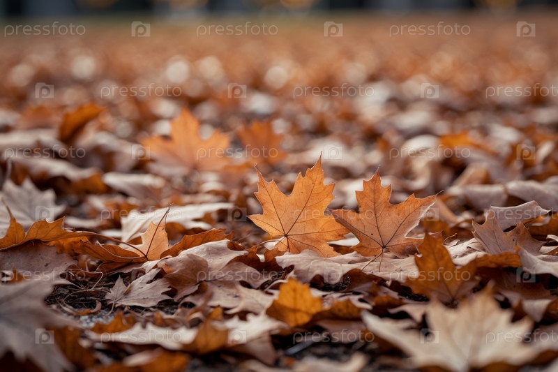 AI Generative Осенний атмосферный фон с желтыми и красными листьями, лист лежит на земле в лесном парке