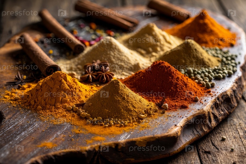 Различные многие ароматические вкусы сухие специи порошковые кучи ассортимент в стеклянных банках миски AI Generative