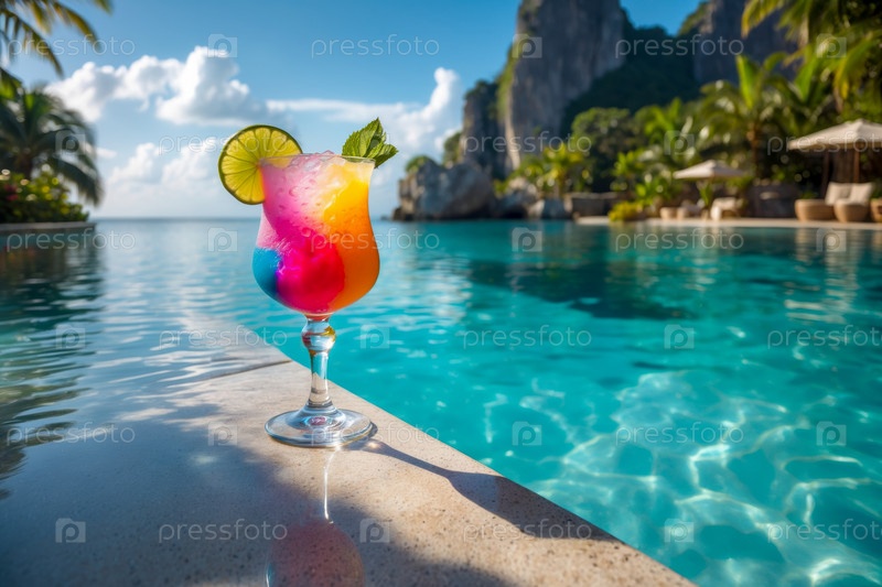 AI Generative Алкогольный коктейль на фоне бассейна, летний напиток фрукты в отпуске sea ocean